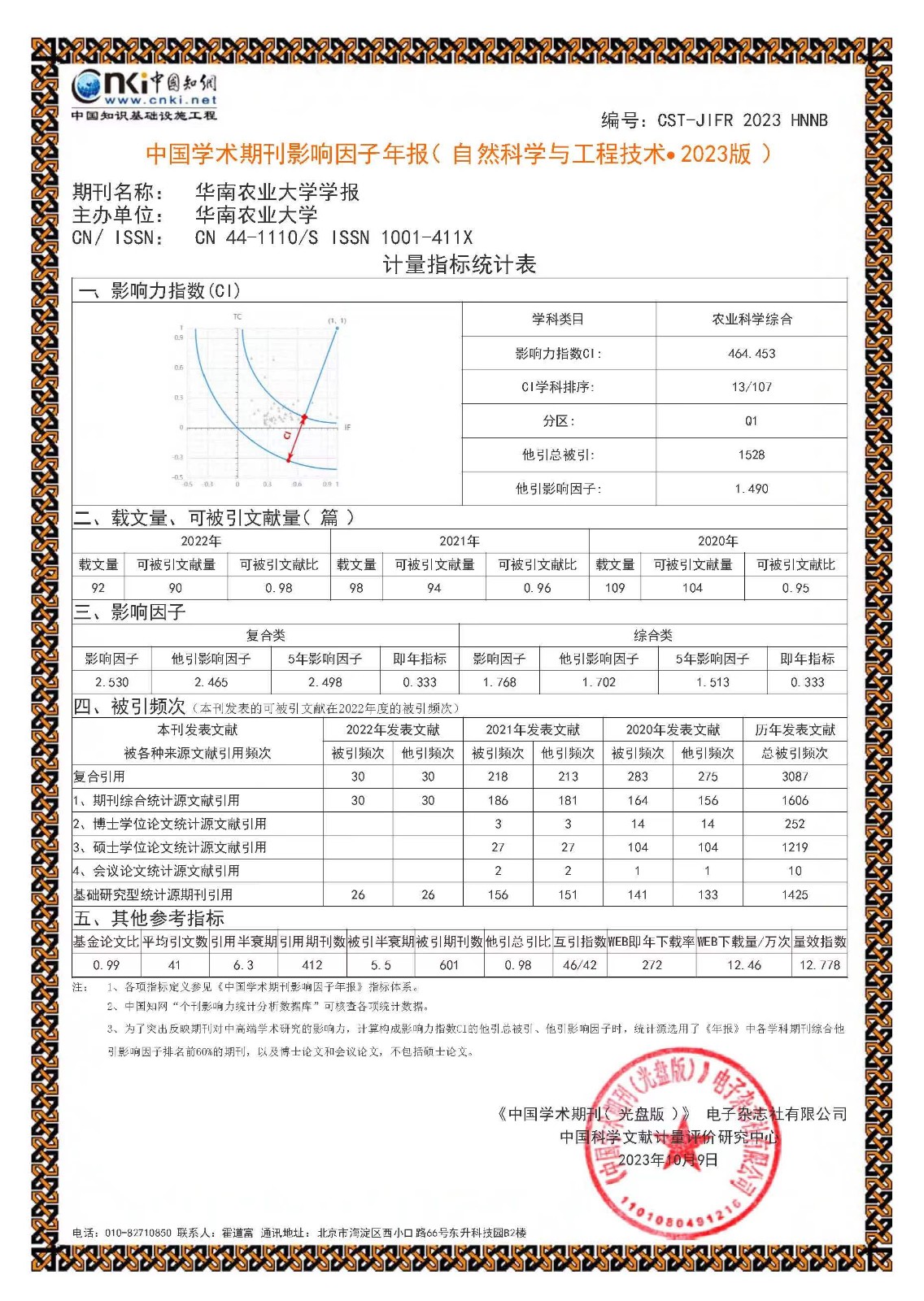 近期,中国知网公布了《中国学术期刊影响因子年报(自然科学与工程•2023版)》,《华南农业大学学报 》(以下简称《学报》)的复合影响因子(JIF)继续提升,达到2.530,相比2022版的2.349和2021版的2.000,《学报》复合JIF稳步提升。影响力指数(CI)在“农业科学综合”类学科排序为13/107,高于2022年公布的CI学科排序14/104,继续领跑Q1区。