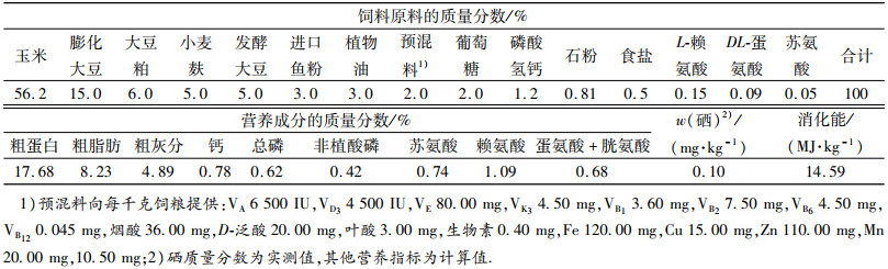 1 材料与方法 1.1 试验材料纳米硒:由广州博仕奥生物技术有限公司生产,品名奥尔硒,为纳米级的单质硒,单质硒质量分数为0.5%.酵母硒:由北京奥特奇生物制品有限公司生产,品名赛乐硒,有机硒质量分数为0.2%.亚硒酸钠(Na2SeO3):由衡阳市石鼓区华地饲料添加剂厂生产,饲料级Na2SeO3,硒质量分数1%.
