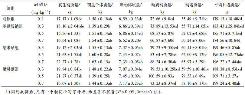 2 结果与分析 2.1 不同硒源对母猪繁殖性能及仔猪生长性能的影响由表 2可知,与对照组相比,0.3和0.5 mg ·kg-1硒添加量酵母硒组、0.5和0.7 mg ·kg-1硒添加量纳米硒组的仔猪初生窝质量分别提高了16.13%和23.88%、25.98%和29.70%(P < 0.05).饲粮硒添加量为0.5 mg ·kg-1的酵母硒组仔猪断奶窝质量、窝增质量、平均日增质量分别较对照组提高了38.44%、42.96%和17.07%(P < 0.05);饲粮硒添加量为0.5 mg ·kg-1的酵母硒组仔猪断奶窝质量、窝增质量、平均日增质量分别与亚硒酸钠各硒水平组相比,差异显著(P < 0.05);亚硒酸钠、纳米硒组内各硒水平组间的仔猪初生个体质量、断奶窝质量、窝增质量和平均日增质量差异不显著(P > 0.05).