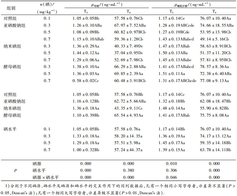 由表 3可知,硒源、硒水平以及硒源和硒水平的交互作用对母猪血清T3质量浓度的影响极显著(P < 0.01);从不同硒源看,与对照组相比,亚硒酸钠组、酵母硒组和纳米硒组母猪血清T3质量浓度分别提高10.47%、4.76%和29.52%;其中纳米硒组母猪血清T3质量浓度分别较亚硒酸钠组和酵母硒组提高了17.24%和23.64%(P < 0.01).从不同硒水平分析,与0.7 mg ·kg-1硒添加量组相比,0.3、0.5 mg ·kg-1硒添加量组母猪血清T3质量浓度分别提高了33.00%和29.00%(P < 0.01).从硒源和硒水平分析,纳米硒0.3、0.5 mg ·kg-1硒添加量组母猪血清T3质量浓度略高于0.7 mg ·kg-1硒添加量组,但差异未达显著水平(P > 0.05).酵母硒0.3、0.5 mg ·kg-1硒添加量组母猪血清T3质量浓度显著高于0.7 mg ·kg-1硒添加量组(P < 0.01).