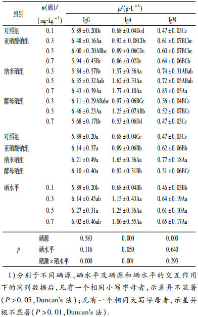 3.3 不同硒源和硒水平对母猪、哺乳仔猪免疫功能的影响大量的研究表明,硒能提高畜禽机体的免疫机能[11-13].此外,日粮中添加酵母硒和纳米硒能显著提高仔猪抗氧化能力[14],抗氧化能力的提高在一定程度上也促进机体免疫机能.硒可通过提高畜禽体内的吞噬细胞数量、促进淋巴细胞的增殖及畜禽抗体和免疫球蛋白的合成,提高免疫反应.由浆细胞产生具有免疫功能的球蛋白(抗体)是体液免疫的关键,研究发现硒能刺激免疫球蛋白的形成,提高机体的抗体滴度,增强体液免疫[15-16].此外,有研究报道,硒缺乏对T细胞在免疫反应中的克隆增殖作用有不良影响,补充一定剂量的硒可使动物对有丝分裂原的敏感性提高,促进T淋巴细胞(Tc)的增殖和转化,提高自然杀伤细胞(NK)的活性[17-18].