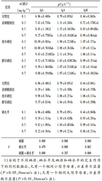 2.3.2 不同硒源和硒水平对哺乳仔猪血清IgG、IgA、IgM的影响由表 5可以看出,硒源、硒源和硒水平间的交互作用对哺乳仔猪血清IgG质量浓度有极显著的影响(P < 0.01).从不同硒源分析,与对照组相比,哺乳母猪饲粮添加亚硒酸钠、纳米硒和酵母硒组仔猪血清IgG质量浓度分别提高了19.11%、43.39%、34.63%(P < 0.01).从饲粮硒源和硒水平看,纳米硒0.3 mg ·kg-1硒添加量组血清IgG质量浓度较0.7 mg ·kg-1硒添加量组提高了11.24% (P < 0.05).酵母硒各硒水平添加量组间哺乳仔猪血清IgG质量浓度差异不显著(P > 0.05).