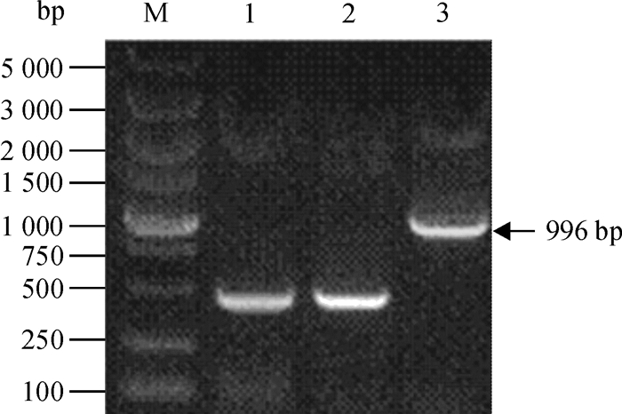2 结果与分析 2.1 ChIFN-α-ChIL-18融合基因的构建以重组质粒pMD19-T/ChIFN-α和pMD19-T/ChIL-18为模板PCR扩增IFN-α和IL-18片段,得到ChIFN-α和ChIL-18 PCR扩增产物,大小分别为489和510 bp;采用P2/P3引物对扩增到了大小为996 bp左右的ChIFN-α-ChIL-18融合基因,这些扩增产物大小均与预期的相一致(图 1).说明采用融合PCR方法成功构建了ChIFN-α-ChIL-18融合基因.