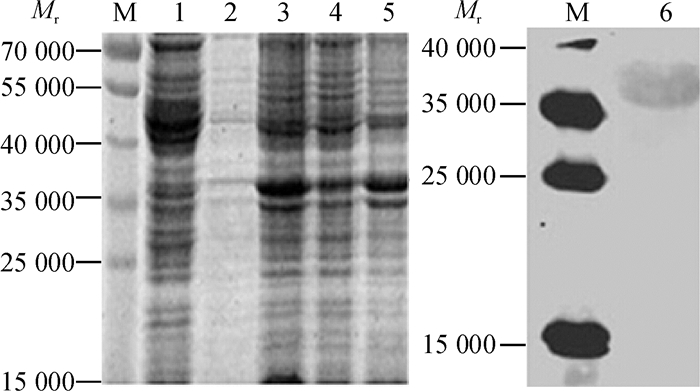 图 2 pET28a-ChIFN-α-ChIL18/BL21 SDS-PAGE和Western-blot分析 Figure 2 SDS-PAGE and Western-blot analyses of pET28a-ChIFN-α-ChIL18 M:相对分子质量低的蛋白Marker;1:pET28a/BL21空载体菌表达对照;2:BL21诱导表达对照;3:pET28a-ChIFN-α-ChIL18/BL21诱导后包涵体沉淀;4:37 ℃ pET28a-ChIFN-α-ChIL18/BL21诱导后上清液;5:16 ℃ pET28a-ChIFN-α-ChIL18/BL21诱导后上清液;6:Western-blot分析. |