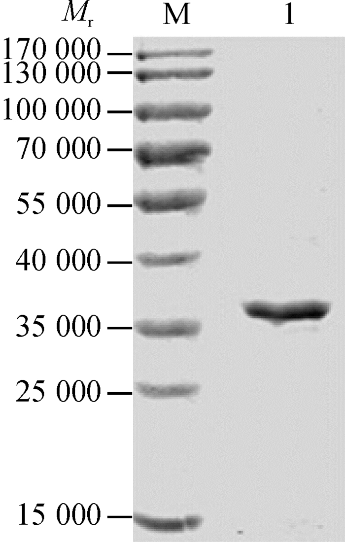 图 3 rChIFN-α-ChIL18蛋白纯化结果 Figure 3 SDS-PAGE analyses of the purified protein rChIFN-α-ChIL18 M:相对分子质量低的蛋白Marker;1:纯化后的rChIFN-α-ChIL-18蛋白. |