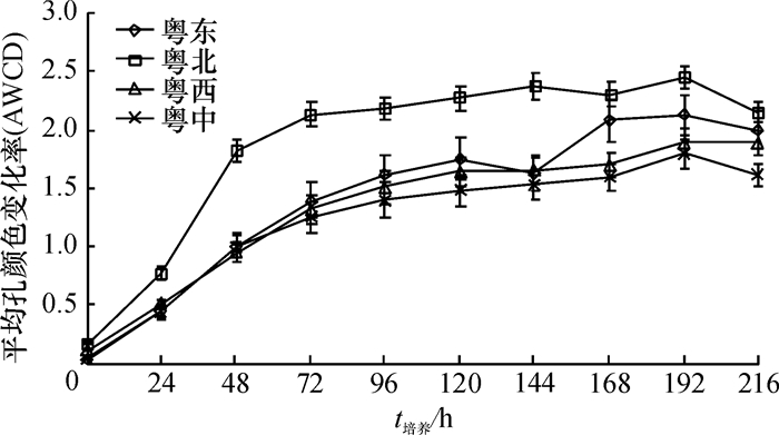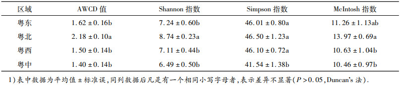 2 结果与分析 2.1 不同区域菜园土壤平均颜色变化率和多样性指数比较4个不同区域菜园土壤微生物平均颜色变化率(AWCD)随培养时间的变化情况见图 1.由图 1可以看出,不同区域的AWCD值在24 h内升高幅度非常大,说明此时碳源开始被利用,且已经进入指数期,144 h左右达到平稳状态.不同区域土壤微生物AWCD值的变化速率和最终值以粤北最高,粤东次之,粤西和粤中微生物活性最低.4个区域土壤微生物AWCD值变化趋势不同,表明了各个区域土壤微生物在碳源利用能力、微生物丰度等方面存在差异,粤北地区土壤微生物群落的代谢最快、活性最强,粤中地区土壤微生物群落代谢相对较慢、活性较弱,可能与温湿条件、施肥和管理等因素有关,微生物活性受温度和水分的影响,粤北地区由于昼夜温差较大、降雨量充沛,为土壤微生物群落提供了良好的生态环境.另外,微生物受土壤环境条件的限制,长期使用化肥严重影响土壤微生物活性,据调查,粤西和粤中地区化肥投入量显著高于粤东和粤北地区,因此,明显抑制了微生物的活性.