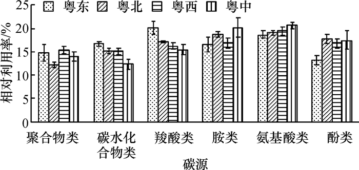 Biolog Eco微平板上含有31种碳源,根据碳源官能团不同将其分为6类,其中,聚合物类4种,碳水化合物类10种,羧酸类7种,氨基酸类6种,胺类2种,酚类2种. 4个区域土壤微生物群落对6类碳源的相对利用率见图 2.由图 2可以看出,菜园土壤微生物在碳源代谢方面优势群落依次为氨基酸类代谢群落、胺类代谢群落、羧酸类代谢群落,对氨基酸类的利用程度较高,对聚合物类的利用程度较低.4个不同区域菜园土壤微生物对6类碳源的利用程度存在差异,同一区域对不同碳源的利用程度也有差异,如:粤东地区土壤微生物对羧酸类的利用程度最高,相对利用率为20.1%,酚类最低,为13.2%;粤中地区土壤微生物对氨基酸类的利用程度最高,相对利用率为20.6%,对碳水化合物类利用最低,为12.4%.