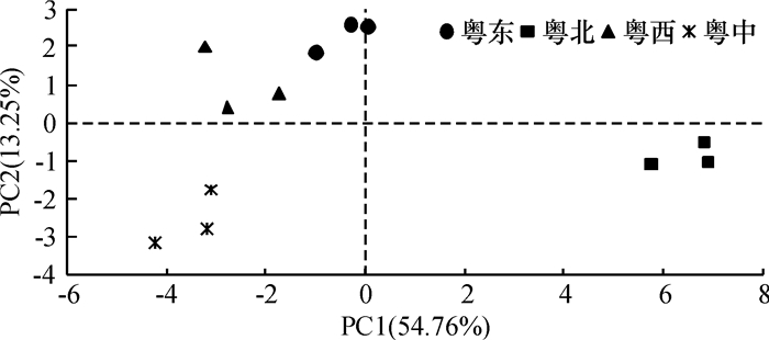 由于土壤微生物群落代谢功能与环境因子有关,可将PCA分析后的主成分纳入到与环境因子(温湿条件和施肥管理制度)的相关分析中,其各自的载荷不同代表了各个区域菜园土微生物碳代谢的差异.前11个主成分占总变异的100%,包含了全部的变异信息.根据提取的主成分个数一般要求累计方差贡献率达到85%的原则[8],共提取了5个主成分,累计贡献率达88.20%.其中第1主成分(PC1)的方差贡献率为54.76%,第2主成分(PC2)为13.25%.第3~5主成分贡献率均较小,分别为8.38%、8.00%和3.81%.选取前2个主成分进行分析,以PC1为横轴、PC2为纵轴,得到不同处理土壤微生物碳源利用的主成分分析图(图 3).由图 3可以看出,4个不同区域的土壤微生物在PC1轴和PC2轴上的得分系数有很好的分离,粤北地区在PC1轴上与其他3个区域的类群散点距离较大,粤中地区在PC2轴上与粤东地区和粤西地区差异较大,表明不同区域土壤微生物在碳源利用模式上有明显差异;粤东和粤西2个区域土壤微生物群落具有相似的碳源利用模式,土壤微生物群落代谢功能相似.Garland[6]认为,各样本在空间位置上的不同是和碳源底物的利用能力相关联的,即各样本在PC空间轴坐标的差异与聚集在该PC轴上碳源的利用能力相关联.