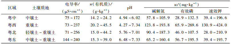 1 材料与方法 1.1 材料根据广东省不同地区温湿度条件和施肥管理情况不同,选择了粤东(梅州五华)、粤北(清远连州)、粤西(云浮罗定)和粤中(广州增城)4个区域,分别在上述4个典型县(市)采集3年以上连续种植蔬菜的菜地土壤样品,每个典型县(市)取0~20 cm土层的混合土样5个.种植蔬菜品种较多,主要有生菜、芥菜、油麦菜、青菜、藤菜、豆角、苦瓜、茄子等.复种指数高,1年3茬的种植模式占42%.经问卷调查,每年按666.7 m2施化肥氮(N)、磷(P2O5)、钾(K2O)分别为29.60、30.44、29.41 kg;有机肥氮、磷、钾均值与化肥氮、磷、钾均值之比分别为0.38、0.22和0.21;总施肥量氮、磷、钾平均达到40.75、37.10和35.72 kg.不同地区养分投入量存在较大差异,云浮和梅州的有机养分投入量略高于清远、增城;化肥和总养分投入量均为:粤中>粤西>粤东>粤北.表 1列出了4个典型区域土壤的主要理化性质.