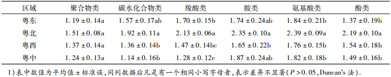 不同区域对同一碳源的利用情况存在差异(表 3),粤北地区菜园土壤微生物对6类碳源的利用能力均高于其他3个区域,且对羧酸类、氨基酸类和酚类的利用能力显著高于其他3个区域.不同区域对同一碳源利用程度的差异表明不同区域优势群落不同,这是由于各区域温湿条件和施肥制度不同,导致优势群落有所不同,因此,各区域土壤微生物功能多样性也不同.