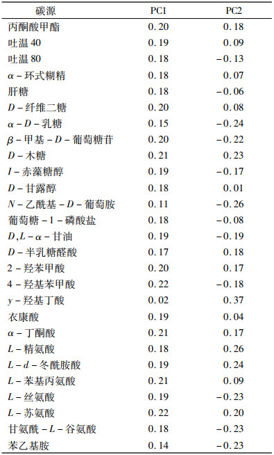 表 4 对主成分贡献大于0.18或小于-0.18的主要碳源 Table 4 Main carbon sources on the contribution of principal components |