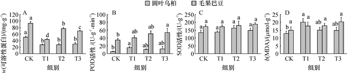 在干旱胁迫下,圆叶乌桕幼苗体内SOD活性呈现先升后降的趋势,在T2处理时达到峰值,但各胁迫组与CK组的差异不明显(图 1C);随干旱胁迫强度的增加,毛果巴豆的SOD活性则呈现逐渐上升的趋势,在T3处理时达到最大,但各胁迫组与CK组的差异也未达到统计学显著性水平(图 1C).