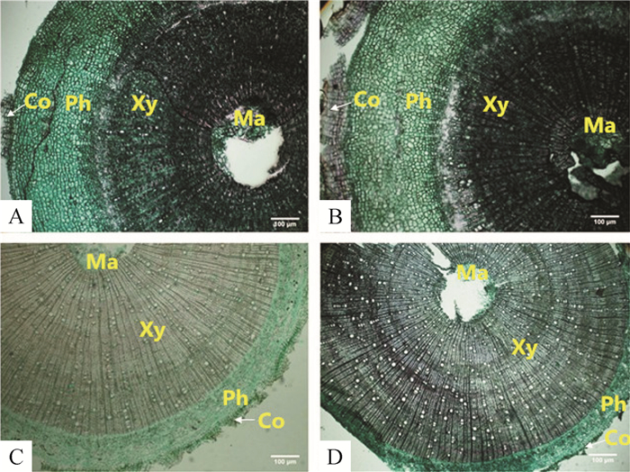 图 2 圆叶乌桕和毛果巴豆幼苗的基茎横切面 Figure 2 Stem anatomical structures in the seedlings of Triadica rotundifolia and Croton lachnocarpus Ma:髓;Xy:木质部;Ph:韧皮部;Co:皮层. A:圆叶乌桕CK组;B:圆叶乌桕T3处理组;C:毛果巴豆CK组;D:毛果巴豆T3处理组. |