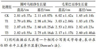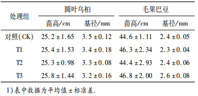 2.2 干旱胁迫对幼苗生长量的影响生长检测结果表明,在干旱胁迫处理90 d时,干旱胁迫组苗木的平均苗高净生长量小于CK组;随着干旱胁迫强度的增加,苗高净生长量呈下降趋势,但胁迫组苗木基径平均净生长量大于CK组(表 3).方差分析结果表明,圆叶乌桕干旱胁迫组与CK组的苗高净生长量差异不明显,而T1处理组的基径净生长量与CK组的差异达到显著水平;毛果巴豆各干旱胁迫组与CK组苗高净生长量的差异达到显著水平,T2处理组与CK组苗木基径净生长量的差异达到显著水平.