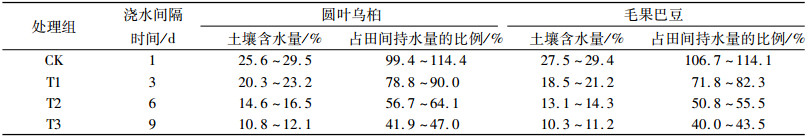 表 2 2种植物不同干旱处理组苗木的土壤含水量 Table 2 Soil moisture of two species under different drought treatments |