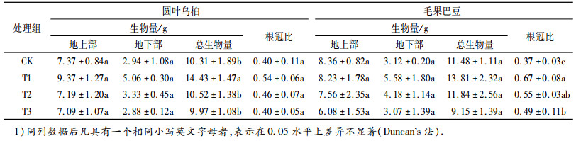 1.3.3 幼苗生物量检测幼苗经105 ℃烘箱中烘15 min杀青后,置于70 ℃烘干24 h,测定地上部、地下部生物量和总生物量,并计算根冠比(植株地下部生物量/地上部生物量).