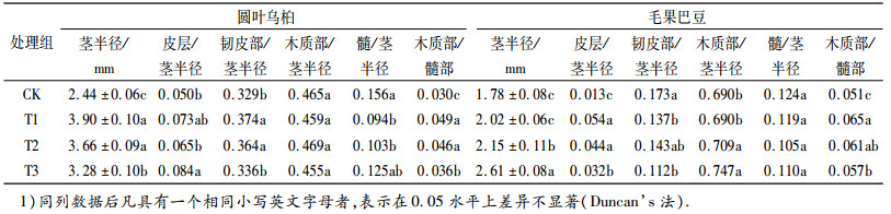 干旱胁迫是石灰岩山地植物生长的主要限制因素.本研究结果揭示了干旱胁迫均不利于2种石灰岩乡土树种的苗高生长,但其基径增粗.这与其他耐旱植物对干旱胁迫的生长响应趋势[15]相似.茎部解剖结果表明,2种苗木茎部皮层、韧皮部、木质部和髓部比例存在一定的差异,干旱胁迫条件下,2种植物木质部与髓部厚度比值均显著增加,反映2个树种均可通过增加与水分输导相关的木质部与髓部比值来适应干旱胁迫.