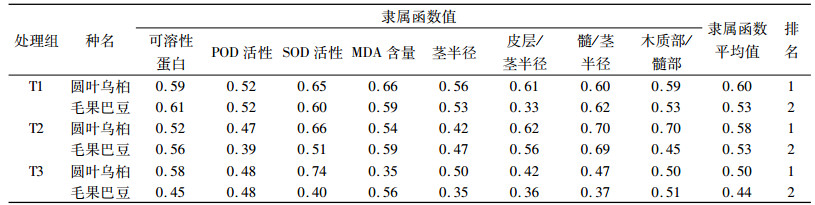 植物耐旱性是受多种因素影响的复杂综合性状,应用尽可能多的指标进行综合评价,可避免和弥补单个指标评定结果的片面性,使评定结果与实际结果更为接近.基于可溶性蛋白含量、POD酶、SOD酶和MDA含量4项生理指标及茎组织结构参数所进行的模糊隶属函数值综合评价结果(表 6)表明:无论是轻度干旱(T1处理组),还是中度干旱(T2处理组)或重度干旱(T3处理组),圆叶乌桕的综合耐旱能力均略强于毛果巴豆.