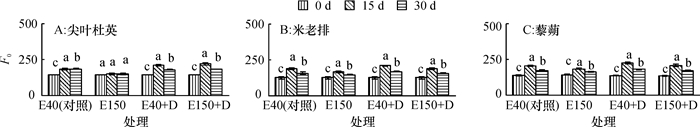 2 结果与分析 2.1 臭氧和干旱胁迫下幼苗的最小初始荧光变化随着臭氧和干旱胁迫时间的延长,3种幼苗的最小初始荧光(F0)变化如图 1. E40处理的尖叶杜英幼苗F0随时间持续小幅上升后保持稳定;E150处理的幼苗基本保持稳定,E40+D和E150+D处理的幼苗先升后降,三者30 d时比0 d分别比对照显著下降3%、23%和26%(P<0.05).米老排幼苗各处理的F0随着时间延长先上升后下降,E150、E40+D和E150+D处理的30 d时比0 d分别显著上升16%、33%和25%(P<0.05).藜蒴幼苗4个处理的F0变动趋势与米老排相似,E150、E40+D和E150+D处理的30 d时分别比0 d显著上升8%、33%和22%(P<0.05).
