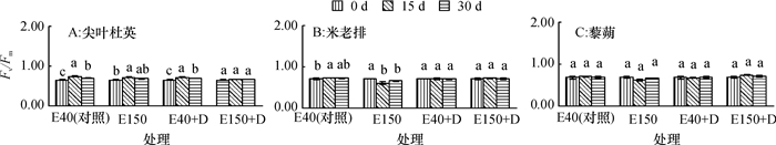 由图 2可见,随着时间延长,E40、E150和E40+D处理的尖叶杜英幼苗的Fv/Fm先升后降;E150+D处理保持稳定.米老排幼苗E40、E40+D和E150+D处理的Fv/Fm小幅变化,E150处理的下降后小幅上升.藜蒴幼苗4个处理的Fv/Fm随时间持续延长保持稳定,与对照差异不显著.