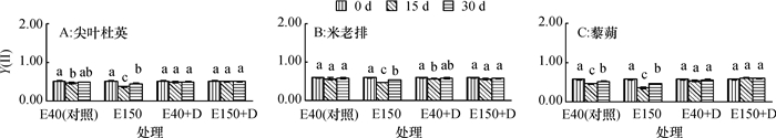 Y(Ⅱ)反映植物的实际光合效率,Y(Ⅱ)的下降,表明植物发生光合受阻,氧释放能力降低是受到环境因子的胁迫. E40+D和E150+D处理的3种幼苗的Y(Ⅱ)保持稳定,说明其受干旱胁迫及臭氧和干旱交叉胁迫的影响不明显. E150处理的3种幼苗的Y(Ⅱ)先降后升,表明臭氧胁迫15 d时其实际光合效率的下降,影响了植物对碳的固定和同化[25],臭氧胁迫30 d时实际光合效率的回升,说明在臭氧逆境下的幼苗实际光合效率的下降是可逆的[26-27].