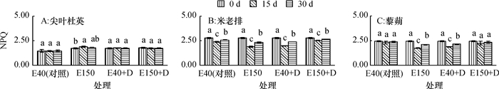 随时间持续,尖叶杜英幼苗各处理的NPQ小幅变化,米老排幼苗各处理的NPQ显著下降后显著上升,E150、E40+D和E150+D处理的30 d时比0 d分别显著下降16%、14%和5%(P<0.05)(图 4). E40和E150+D处理的藜蒴幼苗的NPQ随时间持续而保持稳定,E150和E40+D处理的显著下降后显著上升(P<0.05),E150和E40+D处理30 d时比0 d分别显著下降14%和12%(P<0.05).