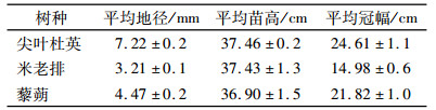 1 材料与方法 1.1 试验材料试验于2012年11月15日在华南农业大学林学院进行.试验所用的尖叶杜英、米老排、黎朔幼苗(每种苗木150株)均为1年生营养袋实生苗,营养袋直径12 cm、高10 cm,基质为黄心土.幼苗生长基本情况见表 1.