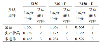 臭氧胁迫、干旱胁迫及臭氧与干旱双重胁迫的程度与植物体内的F0、Fm/Fv、Y(Ⅱ)和NPQ等参数受抑制程度显著相关,可作为植物抗逆的指标,但不同抗逆指标表现往往不一致[18].利用主成分分析法可以全面而准确地分析植物各种生理指标的综合抗性.对标准化后的数据进行主成分分析,以累积贡献率达85%以上为参考值,确定主成分个数.由于主成分之间相互独立且有着不同的贡献率,因此,每个主成分得分就是其加权值,其中权重就是主成分对应的贡献率. E40、E150、E40+D处理的幼苗得分为黎朔>尖叶杜英>米老排,表明黎朔抗臭氧或干旱单一胁迫的能力最强,尖叶杜英次之,米老排最弱;E150+D处理的幼苗得分为尖叶杜英>黎朔>米老排,表明尖叶杜英抗臭氧或干旱交叉胁迫的能力最强,黎朔次之,米老排最弱(表 2).