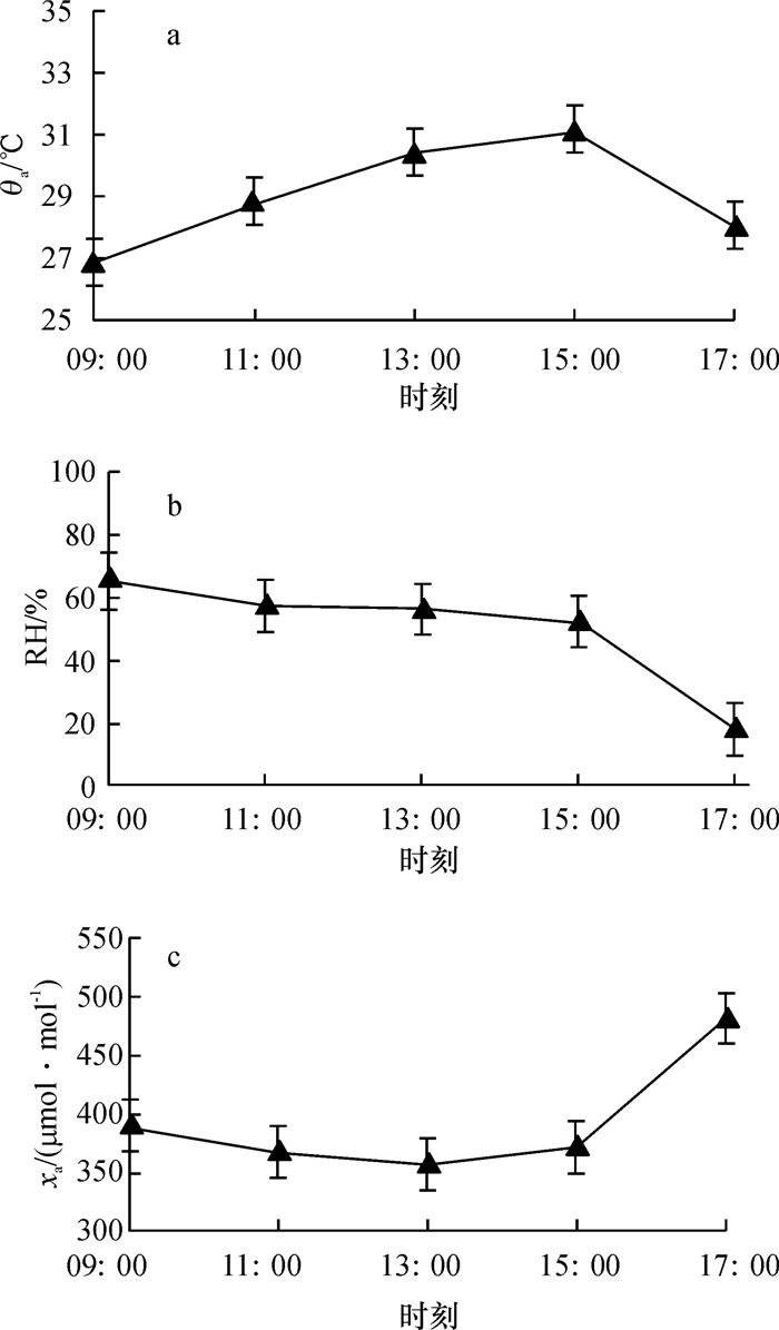 植物的光合作用受多种环境因子的影响,其中温度、空气相对湿度和CO2摩尔分数是影响光合作用的主要环境因素[13].环境因子日变化如图 1所示,θa日变化呈单峰曲线,全天平均29.06 ℃,从09:00时开始逐渐升高,在15:00时左右达到全天最高温度(31.16 ℃),然后迅速下降.RH在09:00时左右达到最高(65.39%),随着时间的推移,因θa逐渐升高,导致RH逐渐降低.xa变化趋势呈倒钟型,09:00时左右开始,随着植物光合作用的进行,xa缓慢降低,午后逐渐回升;13:00时左右出现最低值(356.87 μmol·mol-1),17:00时左右出现全天最高值(482.21 μmol·mol-1),表现为早晚高、中午低,其原因可能是植物在早晚呼吸作用较强,而中午光合作用较强.