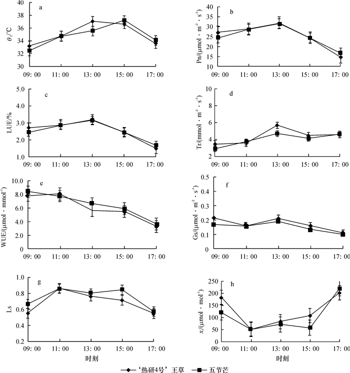 2.2 光合特性日变化 2.2.1 叶温、净光合速率、光能利用效率2种草的θl与θa日变化趋势相同.从图 2 a可见,θl从09:00至15:00不断升高达到最大值后,开始下降.Pn的日变化曲线(图 2 b)较为一致,呈单峰型,说明均无光合“午休”现象;从09:00开始随着θl的升高而逐渐升高,在13:00左右达到全天最大值,‘热研4号’王草和五节芒分别为31.97和29.08 μmol·m-2·s-1,此后逐渐下降;‘热研4号’王草的日均Pn为25.45 μmol·m-2·s-1,略高于五节芒(25.08 μmol · m-2·s-1). LUE日变化趋势(图 2c)与Pn相同,从09:00至13:00不断升高,达到最大值后逐渐下降,其中‘热研4号’王草的最大值(3.2%)高于五节芒(2.9%),说明‘热研4号’王草的光能利用效率高于五节芒.