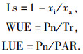 1.3 测定方法试验于2013年5月13日、7月13日、9月2日采用LI-6400便携式光合作用测定仪(Li-Cor, USA)对2种草的光合特性指标进行测定,包括气温(θa)、叶温(θl)、空气相对湿度(RH)、大气CO2摩尔分数(xa)、净光合速率(Pn)、蒸腾速率(Tr)、气孔导度(Gs)、胞间CO2摩尔分数(xi).测定过程中,设定叶室温度为20 ℃,空气流量500 μmol·s-1,光合有效辐射(PAR)1 000 μmol·m-2·s-1.测定时选取充分展开的健康叶片中部,每片每次连续读取3个稳定的数据,共3次重复.测定时间为09:00—17:00,每隔2 h测定1次.根据测定的指标计算叶片气孔限制值(Ls)、水分利用效率(WUE)和光能利用率(LUE),计算公式如下: