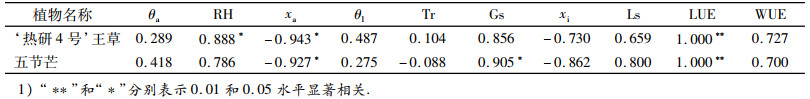 2.3 ‘热研4号’王草和五节芒净光合速率与主要影响因子的相关性分析2种草净光合速率与主要影响因子的相关关系如表 1.因测定时PAR设定为1 000 μmol·m-2·s-1,所以‘热研4号’王草和五节芒的Pn均与LUE(LUE=Pn/PAR)呈极显著正相关(P<0.01,r=1.000).此外,‘热研4号’王草Pn与RH呈显著正相关(P<0.05,r=0.888),与xa呈显著负相关(P<0.05,r=-0.943);五节芒Pn与Gs呈显著正相关(P<0.05,r=0.905),与xa呈显著负相关(P<0.05,r=-0.927).