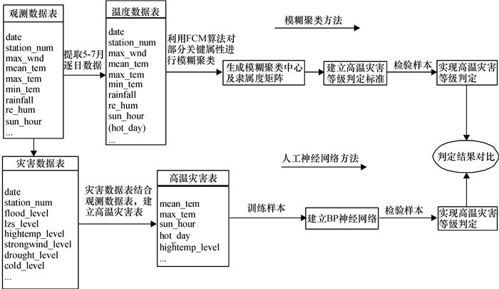 对气象观测数据采用2种方法挖掘分析,预测可能出现的农业高温灾害,并判定灾害等级,达到预测高温灾害发生、及时预警灾害等级的效果.第1种是模糊C均值聚类法(FCM),首先从观测数据表中提取5—7月气象观测逐日数据(7 913条),采用FCM算法对最高气温、高温日数等关键属性进行模糊聚类,利用生成的模糊聚类中心及隶属度矩阵确定高温灾害等级判定标准,再预测未来月份可能出现的高温灾害;第2种是BP神经网络算法,对发布的气象观测逐日数据及同期高温灾害历史数据进行学习,利用训练后的BP神经网络预测未来月份可能出现的高温灾害及其等级;最后,应用2种方法分别对同年8月一段时间的气象观测逐日数据(检验样本)进行判断,对比分析判断结果.农业高温灾害研究流程见图 2.
