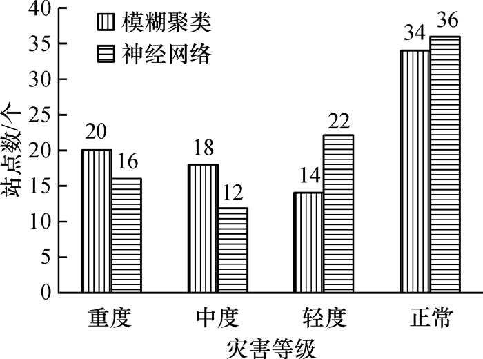 图 3 2种方法各灾害等级的站点数对比 Figure 3 A comparison of station counts between different disaster levels based on fuzzy clustering and neural network |