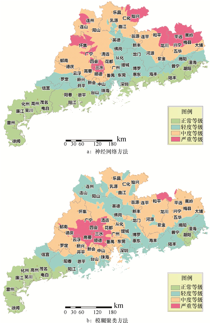 采用模糊聚类方法建立高温灾害等级判定标准,对2011年8月23日气温数据进行灾害等级判定.根据最大隶属度原则,同一个站点在3种灾害等级及正常等级中取隶属度最大者为该站该日高温灾害等级.由于神经网络方法预测的结果与实际发布结果完全一致,所以将模糊聚类方法的结果与神经网络方法结果进行对比.广东省范围内高温灾害不同等级的站点数目的对比结果见图 3.由图 3可见,模糊聚类方法判定的结果与神经网络方法判定结果(即官方发布结果)略有差异,重度和中度灾害等级的站点数偏高,这是模糊聚类生成的聚类中心较神经网络学习的灾害等级阈值略小,所以判定的中度等级以上受灾站点数略高.