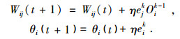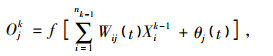 其中,Wij(t)为t时刻单元i与下层单元j间的权系数,θj(t)为t时刻单元j的偏置,Xik-1为t时刻第k-1层单元i的输出.对于输入单元来说,输出就等于输入,即Oj1=Xj.