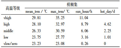 1.4 算法应用 1.4.1 利用FCM算法建立模糊等级与模糊聚类中心先对温度数据表中的平均气温、最高气温和日照时数等属性分别应用FCM算法,利用各自生成的模糊聚类中心,将每个属性分别聚类成5个模糊等级,即较高(vhigh)、高(high)、中(middle)、低(low)、较低(vlow).其次,增加高温日数属性(hot_day),即高温持续的天数(其高温判定标准为:当日平均气温大于平均气温vhigh阈值,或最高气温大于最高气温vhigh阈值,该日为高温灾害).同时利用FCM算法对高温日数属性进行模糊聚类,分别为高(high)、中(middle)、低(low)、零(zero)4类.所得高温模糊等级与模糊聚类中心见表 3.
