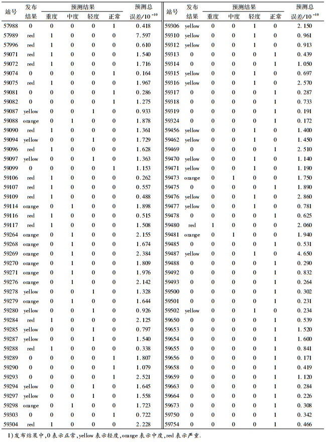 表 4 各站点神经网络方法预测灾害等级与实际发布结果对比1) Table 4 The comparison between public disaster level and predicted result based on neural network at every meteorological station |