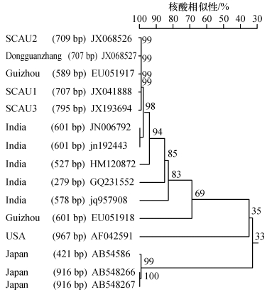 3 讨论与结论ITS序列分析在食用菌快速分类鉴定方面有着极大的优势,本试验通过ITS鉴定及在NCBI中BLAST后,发现SCAU3与guizhou(基因编号为EU051917.1)以及我们之前分离的3个菌株(基因编号分别为JX041888、JX068526、JX068527)有99%的相似性,与India分离的几个菌株(基因编号分别为JN006792、jn192443、HM120872、GQ231552、jq957908)的相似性分别为98%、98%、94%、85%、83%,与美国分离菌株AF042591的相似性只有35%,与日本分离的3个菌株的相似性只有33%,显示出了此菌株与其他菌株的差异性,这说明该菌株为一个新菌株.
