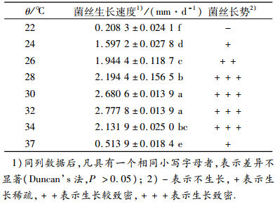 试验采用培养基Ⅰ,分别在22、24、26、28、30、32、34和37 ℃条件下恒温培养,每个处理5个重复,观测不同温度对菌丝生长的影响.