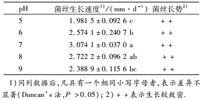 1.4.3 pH筛选试验试验采用培养基Ⅰ,调pH分别为5、6、7、8和9,放置于30 ℃恒温培养箱中培养,每个处理5个重复,观测不同pH对菌丝生长的影响.
