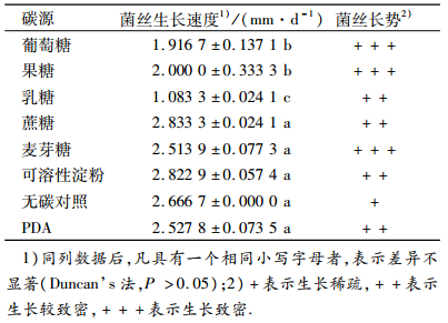 1.4.4 碳源试验试验所用的碳源包括葡萄糖、果糖、乳糖、蔗糖、麦芽糖、可溶性淀粉,分别用20 g的不同碳源代替培养基Ⅱ中的葡萄糖,以不加碳源的培养基Ⅱ做阴性对照,以培养基Ⅰ做阳性对照,于30 ℃恒温培养箱中培养,每个处理5个重复,观测不同碳源对菌丝生长的影响.
