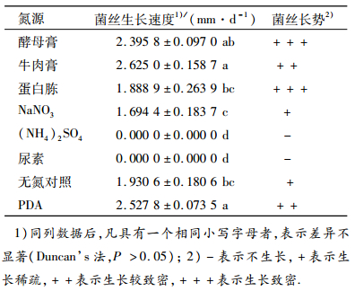 表 4 培养基氮源对野生巨大口蘑菌丝生长的影响 Table 4 Effects of nitrogen sources on the mycelial growth of Tricholoma giganteum |