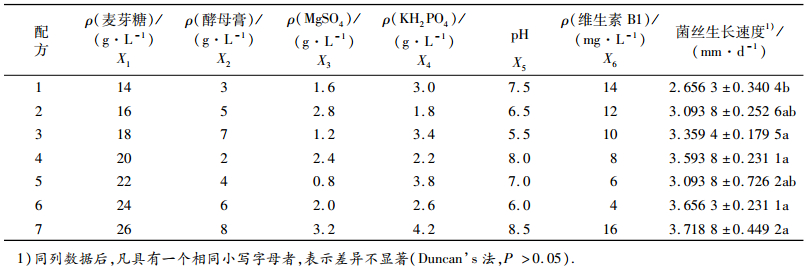 1.4.6 均匀设计优化最适培养基采用均匀设计法优化野生巨大口蘑的培养基配方,在单因素试验结果的基础上,选择麦芽糖、酵母膏、MgSO4、KH2PO4、pH、维生素B1 6个因素作为参试因子,按照6因素7水平的均匀设计表U7(76)进行试验方案设计.每个处理5个重复.