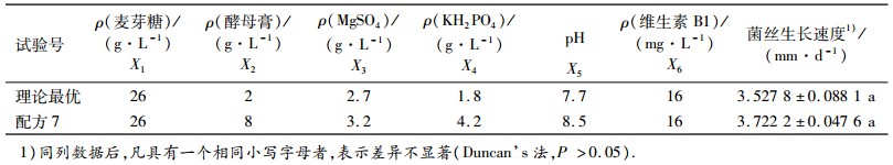 通过DPS9.50进行显著性分析,理论最优组合与组间最优配方7的菌丝生长速度无显著性差异.因此,野生巨大口蘑菌丝生长最适培养基为:麦芽糖26 g·L-1,酵母膏2 g·L-1,MgSO4 2.7 g·L-1,KH2PO4 1.8 g·L-1,pH7.7,维生素B1 16 mg·L-1.