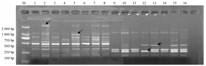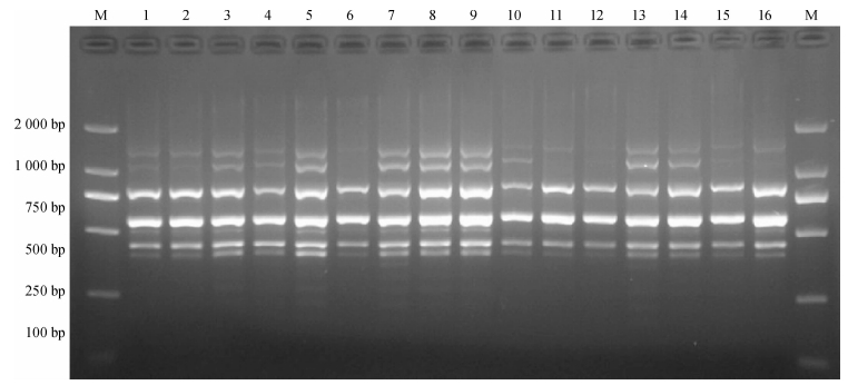 图 1 SRAP-PCR反应体系正交试验结果 Figure 1 Amplified patterns of the SRAP-PCR based on orthogonal design M:DNA maker DL2000;1 ~ 16:处理1 ~ 16(陕西蒲城种源). |