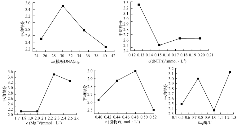 图 2 模板DNA、dNTPs、Mg2+、引物、Taq DNA聚合酶与平均得分的关系 Figure 2 Relationship between concentrations and mean scores of template DNA, dNTPs, Mg2+, primer and Taq polymerase |