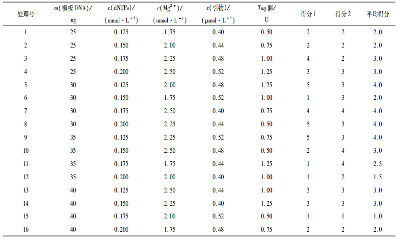 1.6 PCR反应体系的正交试验在对影响苦楝SRAP-PCR反应的模板DNA、dNTPs、Mg2+、引物和Taq酶进行单因子试验后采用L16(45)正交试验设计,共16个处理,每个处理设2个重复,各因素水平见表 1.根据电泳条带的多少、清晰度及背景颜色进行打分.最优的得5分,最差的得1分,并计算每个因素在不同水平下的平均得分[8].