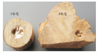1.2 试验方法 1.2.1 髓心率测定1年生木薯茎秆截成下段(接近根部)和中段2部分,4年生截成主茎及分枝中段2部分,再分别截成长为2 cm的茎段,测其直径,计算木薯茎秆髓心所占的体积比(髓心率).