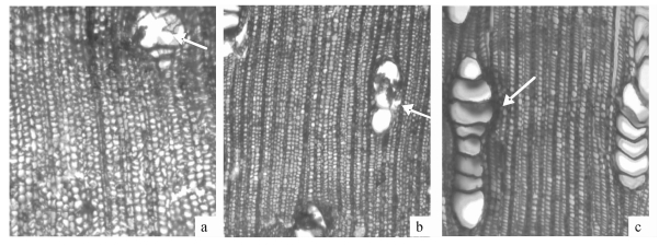 图 2 木薯茎秆的光学显微照片(× 100) Figure 2 Optical micrographs of cassava stems(× 100) a:横切面,箭头示单管孔及其侵填体;b:横切面,箭头示复管孔;c:横切面,箭头示管孔链. |